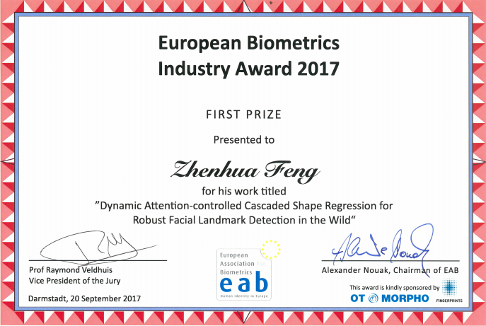 模式识别与计算智能国际联合实验室的博士后研究人员冯振华喜获2017年欧洲生物特征识别工业奖(European Biometrics Industry Award 2017)。