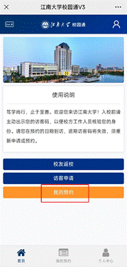 手机关注“e江南”微信公众号,点击屏幕下方“校园服务”中的“访客预约”,进入后点击“我的预约”,点击“查看访客码”即可获得访客码。进入校园时出示访客码。