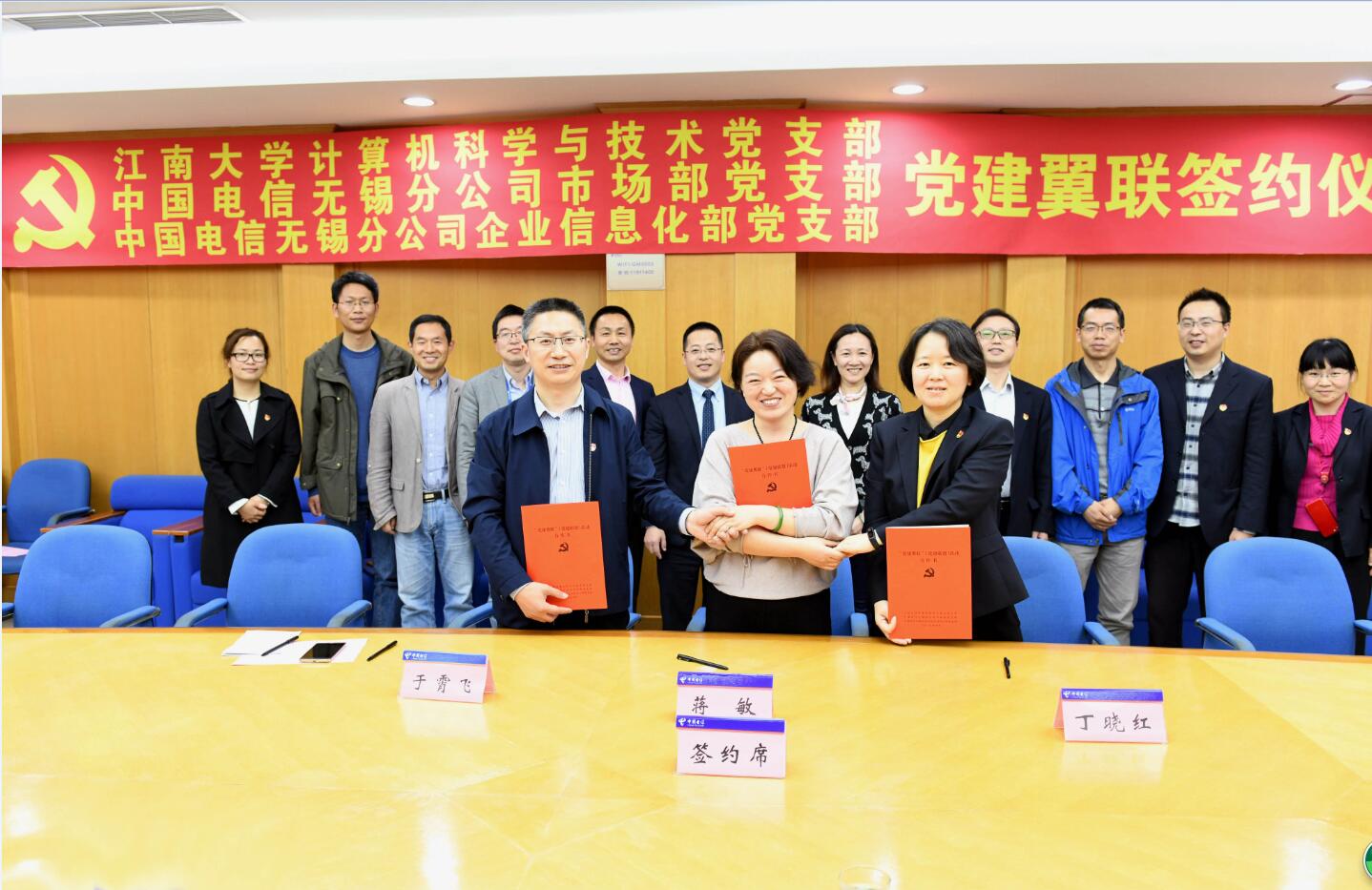 426日下午,百合漫画 百合漫画 计算机科学与技术党支部与中共中国电信股份有限公司无锡分公司委员会市场部支部、企业信息化部支部,开展了“党建翼联”结对共建签约仪式,活动在中国电信无锡分公司国脉大楼3002会议室举行。百合漫画 百合漫画 党委书记程捷音、党委副书记耿向阳、党委委员李光辉,中国电信无锡分公司党委委员、副总经理蒋,以及三个党支部的支部书记、党员骨干参加了本次活动。