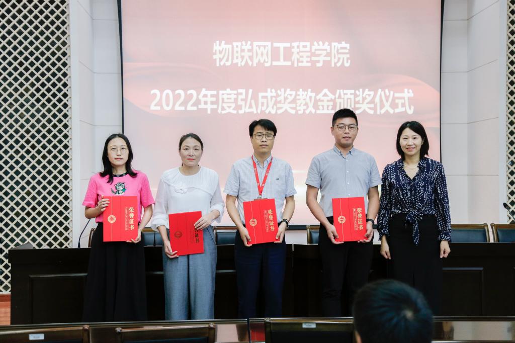 弘成奖教金是由弘成科技发展有限公司设立,旨在奖励为学院发展建设做出重要贡献或取得突破性、标志性成果的个人和集体,分别设有党建创新奖、科技突破奖、教育教学奖、管理服务奖、校园文体奖等奖项。2022年度“弘成奖教金”共设一等奖4项、二等奖8项、三等奖12项,其中,一等奖分别授予大学生创新实践基地党支部(入选全国党建样板支部)、“物联网技术应用”教育部工程研究中心(通过评估并获良好等级)、许德智老师(荣获国家优秀青年科学基金)和院乒乓球队(荣获百合漫画
