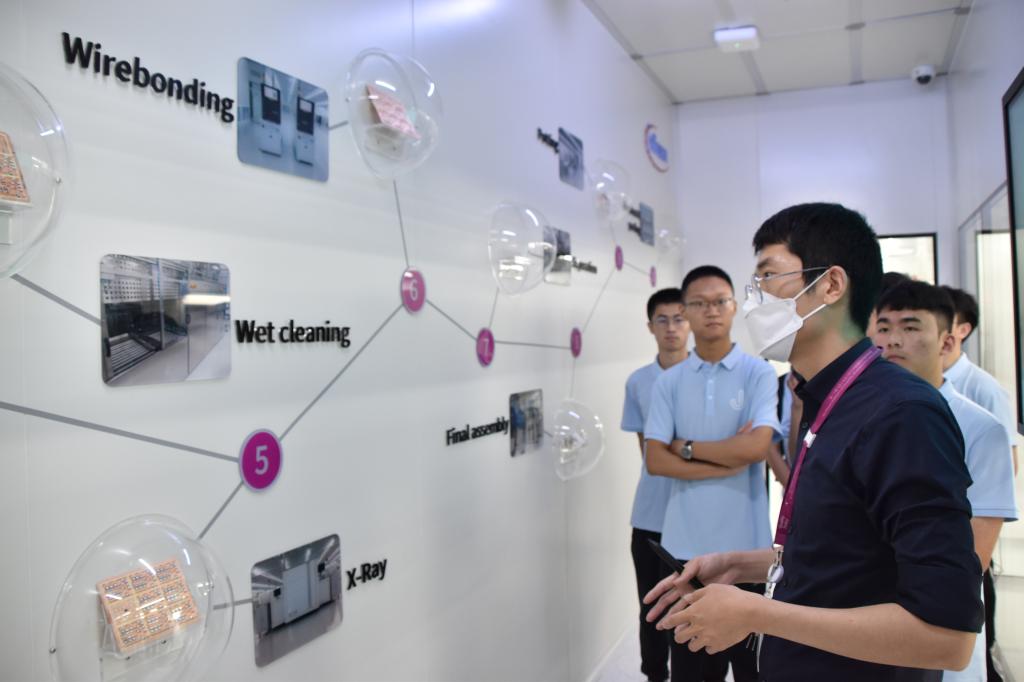 实践团一行先后走访英飞凌科技有限公司、无锡物联网雪浪小镇、无锡国家集成电路设计中心、无锡科技馆。通过走进产品展厅、生产车间、办公场所,近距离感受芯片设计、制造、封装测试的全流程及各环节顶尖技术。聆听行业大咖系列专题讲座,在热烈的互动交流中,进一步了解集成电路产业的发展现状和发展趋势。在“我与校友面对面”专访环节,深入了解学院毕业生的就业情况、行业发展的形势,以及用人单位对毕业生知识、能力、素质要求。实践团成员在深入基层一线进行实地考察中,紧扣国情、社情教育,进一步明晰时代责任和历史使命,立志努力成长为破解“卡脖子技术”难题的青年创新人才。