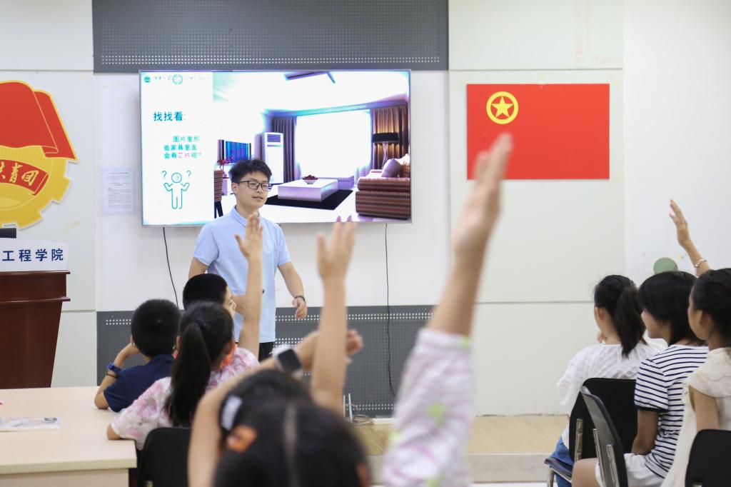 课堂上,当一首耳熟能详的《孤勇者》从志愿者乐泽荣手中单片机激情唱响时,小朋友们不禁发出感叹。“是什么让单片机会唱歌?大家来看这块凸起的部分,这就是我们今天课堂的主角——芯片!”志愿者孔维凯娓娓道来,分别围绕“广泛应用的芯片” “结构复杂的芯片”“大国博弈下的中国芯片”三个部分,以图文并茂的形式,循序渐进地揭开了芯片的神秘面纱。“芯片的内部结构就像一座城市,集成电路就是城市中的马路,而晶体管就是其中的高楼大厦,它们齐心协力让芯片发挥电子设备的大脑、心脏功能。”生动形象的比喻、绘声绘色的讲解和有趣的互动问答,课堂气氛十分活跃。
