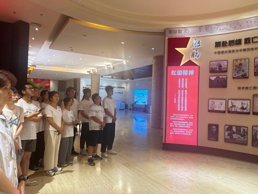 在讲解员的引导下,实践队一行于当天下午参观了无锡滨湖党建馆的大型展览《中国共产党精神谱系》。展览以中国共产党红色精神为主线,历经星火、圣地、烽烟、黎明、奋斗等党史“长廊”,在图文并茂、生动形象的历史“链条”指引下,同学们沉浸感受了贯穿中国和世界的百年沧桑巨变,并在现场以问答互动的形式进一步体悟中国共产党的光辉历程和伟大精神。在丰碑展厅革命烈士纪念墙前,同学们敬献鲜花,缅怀革命先烈。随后,集体观看党史专题视频《红色之路》。影片中一幕幕令人“破防”的画面,一句句直抵心灵的台词,让全体成员受到一次深刻的党性教育和精神洗礼。同学们纷纷表示,从党波澜壮阔的历史中汲取了营养、获取了力量,也更加坚定了“走红色之路,做红色传人”的理想信念。