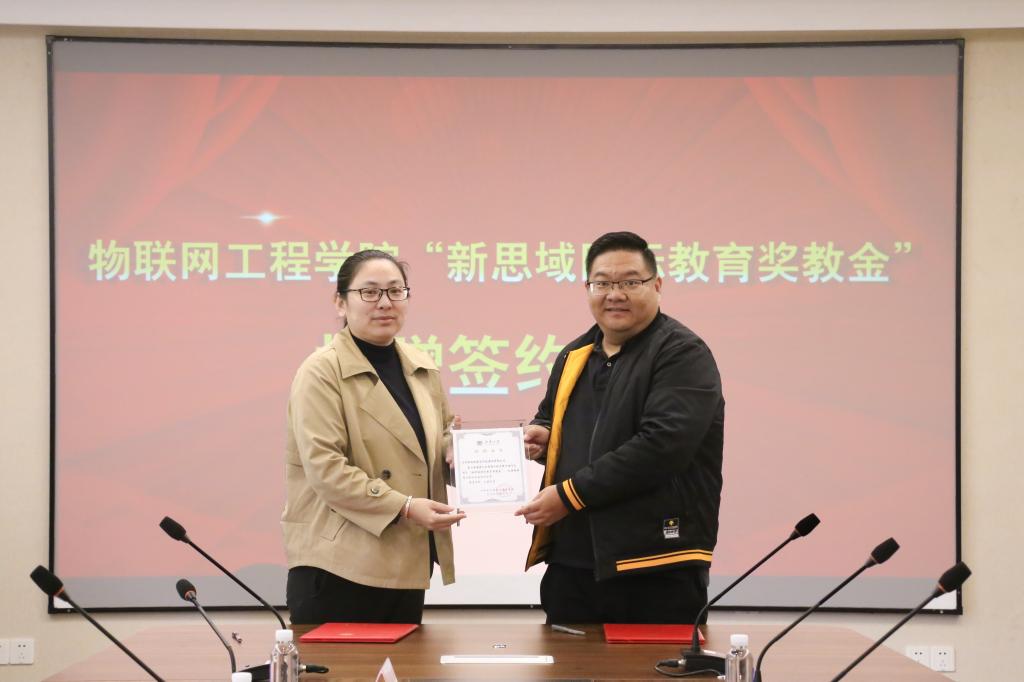 随后,双方签订捐赠协议,孔丽丹代表学院为无锡新思域集团颁发捐赠证书。