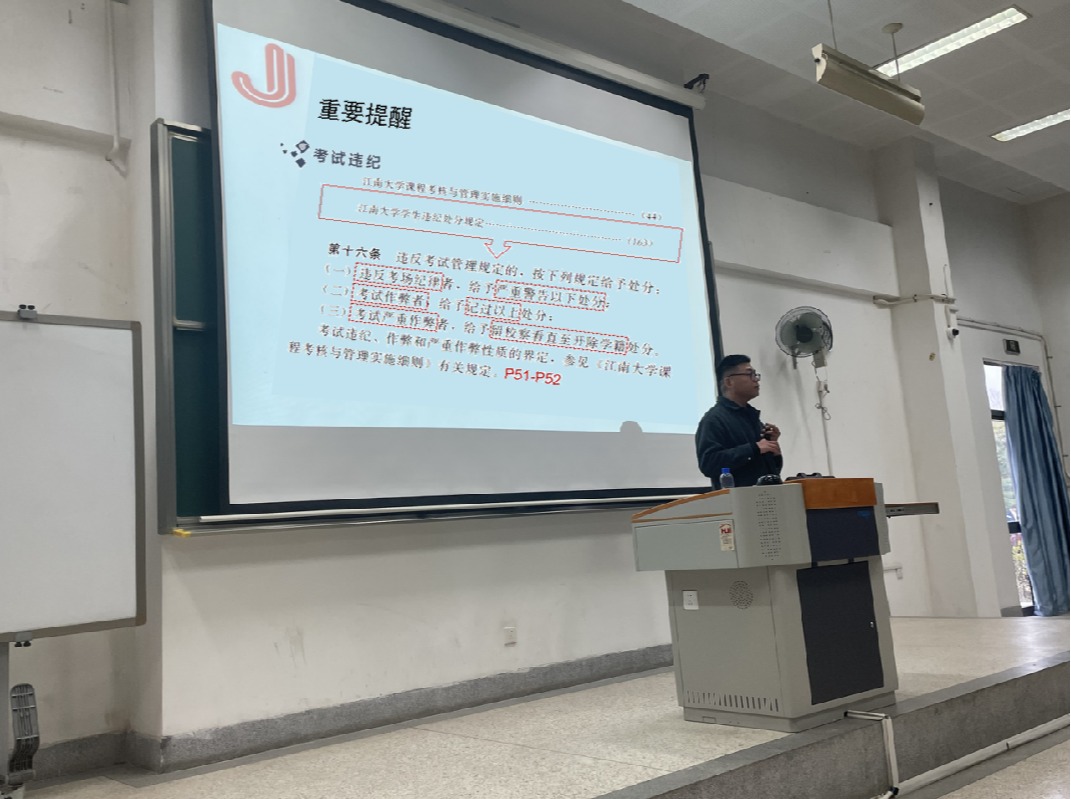 最后,屈跃宽进行诚信考试主题教育。他重点解读了课程考核与管理实施细则,并用真实案例告诫同学们要诚信考试,切勿抱有不劳而获、投机取巧的侥幸心理。屈跃宽还就开学初期的各项管理要求进行了说明,并提醒同学们做好个人健康防护。