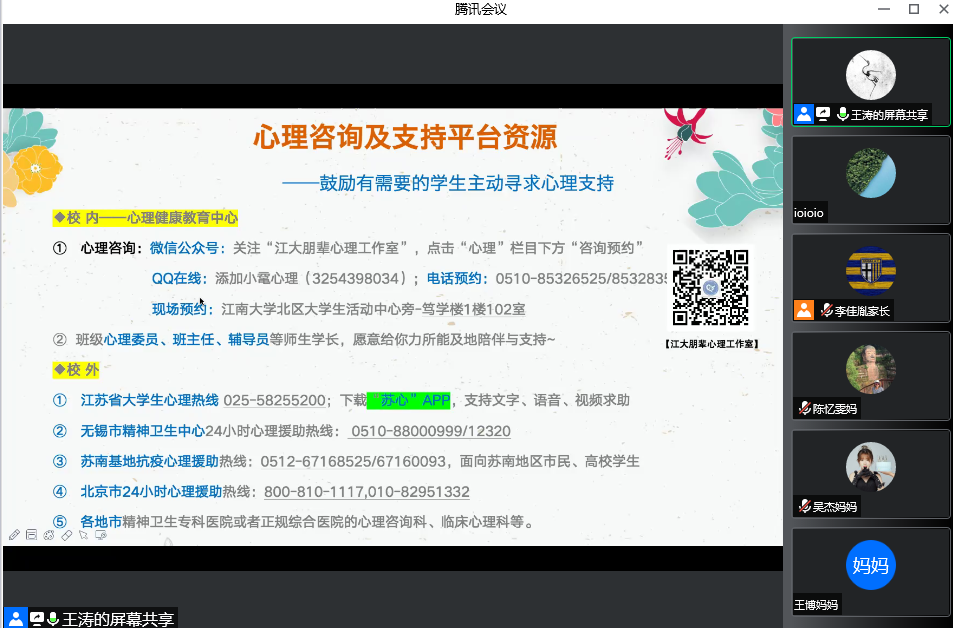 随后,张圆以“心之所系,承载未来”为题,引导新生家长加强对大学生心理健康与发展的关注。她重点从心理危机的标准、当代大学生的基本心理特点及可能面临的心理问题和如何识别学生心理异常等方面展开介绍,并向家长推介了一系列专业的心理健康咨询及支持平台,希望能够形成心理健康教育家校合力,全方位畅通交流沟通渠道,共同为学生的健康成长保驾护航。