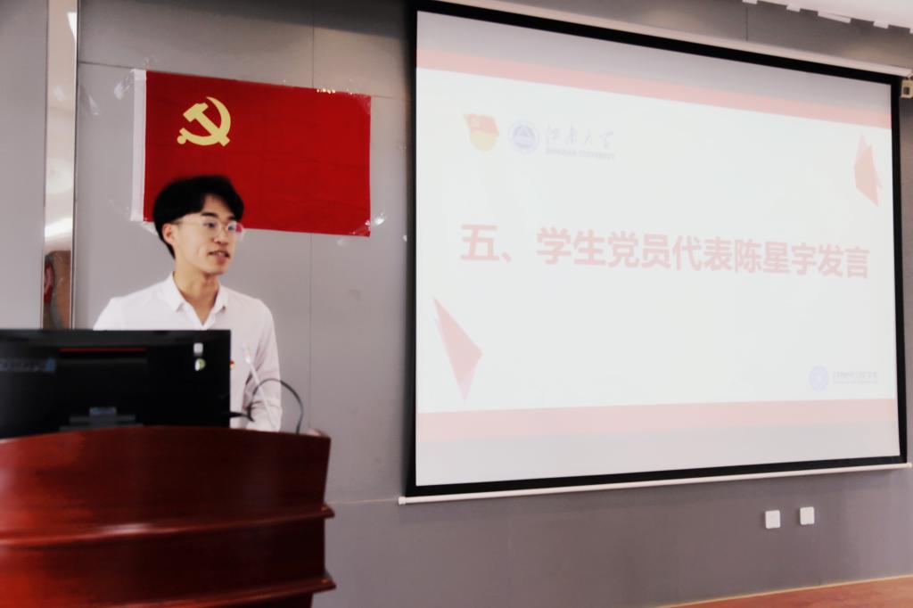 随后,预备党员陈星宇代表全体预备党员发言。他表示要把入党誓词内化于心、外化于行,加强党的理论学习,提高自身政治素养;在日常的工作中积极发挥先锋模范带头作用,勇于担当负责,积极主动作为,用实际行动践行全心全意为人民服务的根本宗旨。