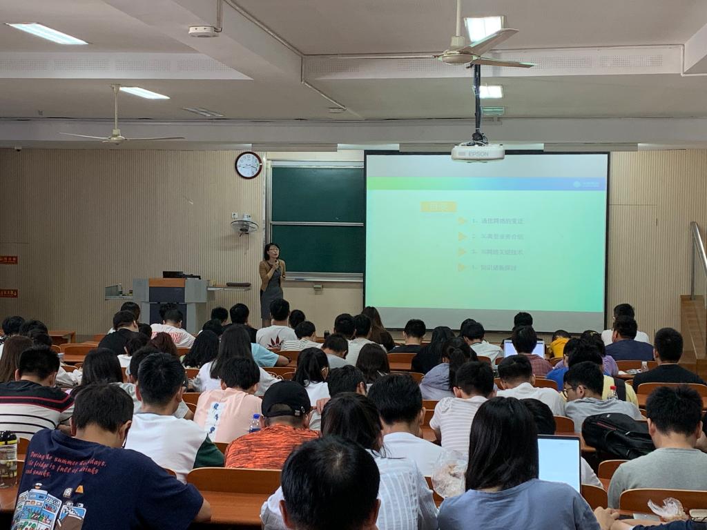 艾怀丽以《漫谈5G与物联网业务》为主题,从通信网络的变迁讲起,系统梳理了从固定电话网到移动电话网,从2G到3G到4G再到现在的5G技术,世界通信网络发展的变迁,从一幅幅图片和艾老师生动的讲述中,同学们感受到了技术的演进带来的无边界效应。接着,艾老师提及通信网络中的云、管、端概念,介绍了5G的关键技术:网络切片、多接入边缘计算MEC等。风趣的语言、生动的5G行业应用实例及深入的商业模式探讨,全方位地展示了5G时代的魅力,也让同学们直观地感受到了5G技术对社会生活的使能作用。原本高深的专业知识经过艾老师平实语言的讲解,变得生动可观,参加讲座的同学全情投入,并不时报以掌声,现场气氛热烈。