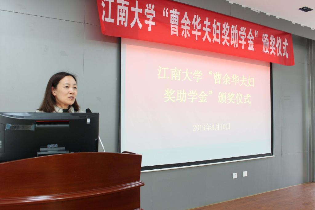 程捷音代表学院对曹余华夫妇一行的到来表示热烈欢迎。她谈了自己对第二次出席“曹余华夫妇奖助学金”颁奖仪式的感想,指出学院的发展离不开社会各界的关心和支持,对曹余华夫妇的捐助表示了衷心感谢。她还提出,希望接受奖助学金的学子们怀着感恩之心,成才后能回报母校、报效社会。