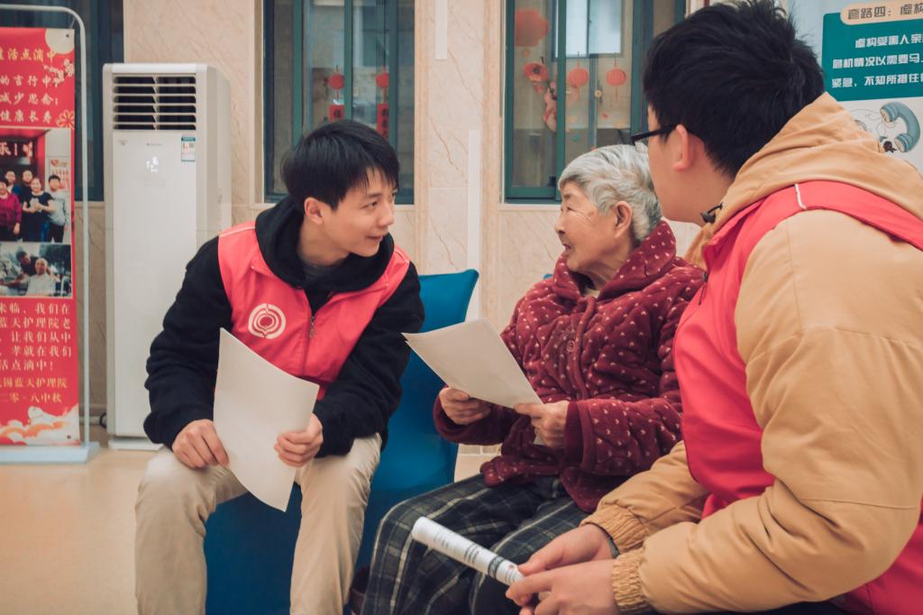 与此同时,另一分队来到了百岁病房,看望101岁的老人顾蓉初。顾老先生年事已高,但是身体依然十分硬朗,他拉着志愿者的手,热切地与志愿者聊起在养老院的生活,皱纹中满是笑意,并鼓励同学们继续做这样有意义的事情。在志愿者们短暂的会合之后,同学们分组进入老人们生活的房间进行参观,并进一步对老人们进行防诈骗知识的宣传,与老人们进行亲切的交谈。许多房间里传来的阵阵笑声与老人们对志愿者们工作与服务的认可,将本次志愿活动的气氛推向高潮。