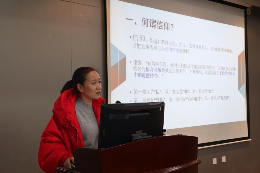 最后,院党委书记程捷音老师以《也谈信仰》为题开展主题团课。她首先以个人经历与同学们的生活感受为切入点,通过与大家探讨何谓信仰,为什么要有信仰,需要怎样的信仰,为什么要信仰共产主义四大问题,作为团课的主线,为同学们打开信仰之门。她引经据典,从正反两面举例指出正确信仰的意义和价值。接着根据中共一大各代表不同的人生轨迹,证明了共产主义的重要作用;通过时代变化的成果,肯定中国特色社会主义道路的正确性。就此,她还推荐了影片《信仰–我们的故事》,并提出习近平的“五点希望”和“四个正确认识”,激励青年们深入学习中国共产党人的信仰,在信仰的大道上不断前行。