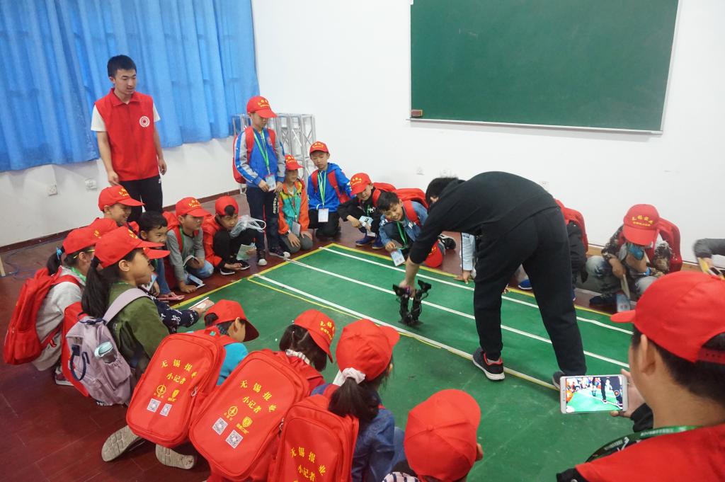 活动开始之后,200名小记者们被分成四组,每组50人,分批参观物联网学院大学生科创基地。在学院志愿者的带领下,小记者们进入科普教室,观看视频。视频中展示了许多的科技创新产品,在场的小记者们借此感受到了科学技术的魅力,也勾起了他们对科技产品浓厚的兴趣。紧接着,志愿者带领小记者们来到了机器人俱乐部、智能小车俱乐部等20多个大学生科创俱乐部进行参观。在场的老师和俱乐部的同学对小车、机器人的功能进行了简单的介绍和现场演示,小车绕s形跑道行进,机器人模仿人类做各种高难度动作。在演示的过程中,气氛热烈,小记者们赞叹不已。演结束示后,小记者们激动地和机器人“握手”,并向在场的工作人员提出自己各种可爱的疑问,让他们对神奇的科技更加好奇。小记者们一边参观,一边讨论,还不时做笔记,拍照留念。