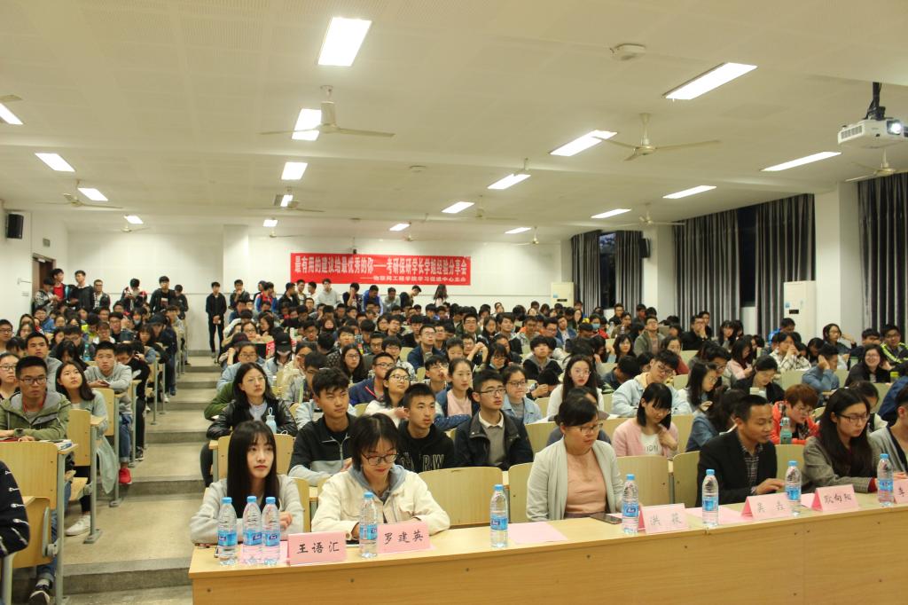 党委副书记、副院长耿向阳,分团委书记吴垚及部分分团委辅导员出席了本次活动。分享会邀请到了今年我院本科2014级考入北京大学、浙江大学、南京大学、华中科技大学、湖南大学以及保研至本校和中国科技大学的7位具有代表性的同学,与2015级准备读研的学弟学妹们分享自己保研、考研的经历以及心得体会。交流会现场座无虚席,来自本科2015级、2016级和2017级的近300位同学参加了此次分享会。