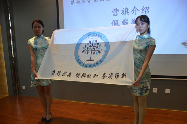 然后,团务中心傅伟聪同学上台向各位领导、营员介绍本此次训练营的策划思路,实施方案和具体课程安排。在主持人的介绍下,礼仪小姐在台前向与会人员展示前辈们精心设计的营旗。主持人介绍了营旗的组成和其设计的内涵,同时,团务中心负责人向各位营员发放了印有营旗的徽章。在欢笑声中,五位到场嘉宾亲手为五位营员代表佩戴了徽章。这样的一幕,意味着传承,预示着起航,大家憧憬的目光中透着的是无穷无尽的希望。随后,仪式在营员代表傅慧榕的发言与营员的集体宣誓中落下帷幕。