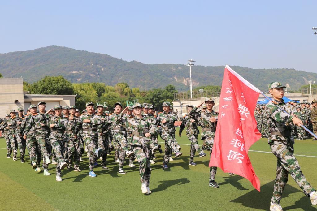 参训学生代表组成分列式方阵,在教官统一指挥下做汇报表演。铿锵有力的口号喊出物联学子昂扬向上的斗志,掷地有声的步伐踏出时代骄子的顽强坚毅,整齐一致的动作划出他们对军事训练的自信从容。
