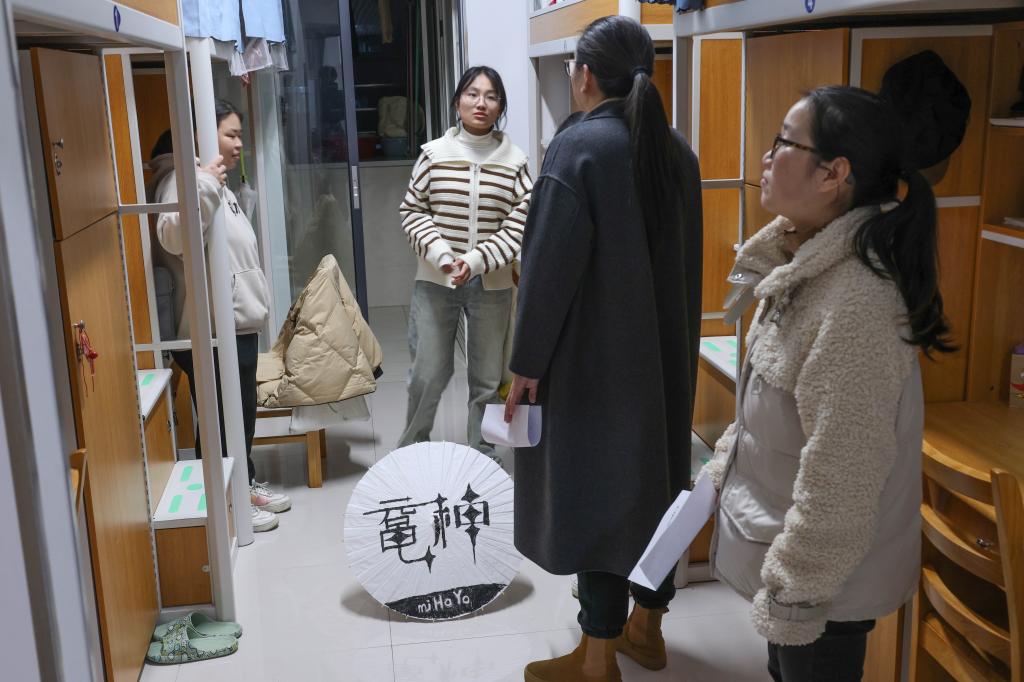 现场展示结束后,各位评委移步至参赛宿舍进行走访。各宿舍代表向评委展示了整洁美观的宿舍风采和环保创意。温馨浪漫的宿舍、新颖有趣的全息投影、生机勃勃的绿植给评委留下了深刻印象。评委们走进每个宿舍,亲切询问学习生活情况,对各参赛宿舍的设计成果给予肯定与赞美。