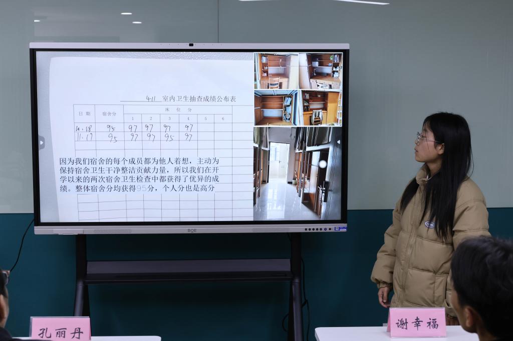 党委副书记兼副院长孔丽丹,2023级本科生辅导员李诗炜、谢幸福,生活服务部指导老师陆奕君,以及橙园宿舍管理员杨竞出席并担任评委。决赛包括现场展示和走访参观两个环节,共有五十余名学生现场观看。
