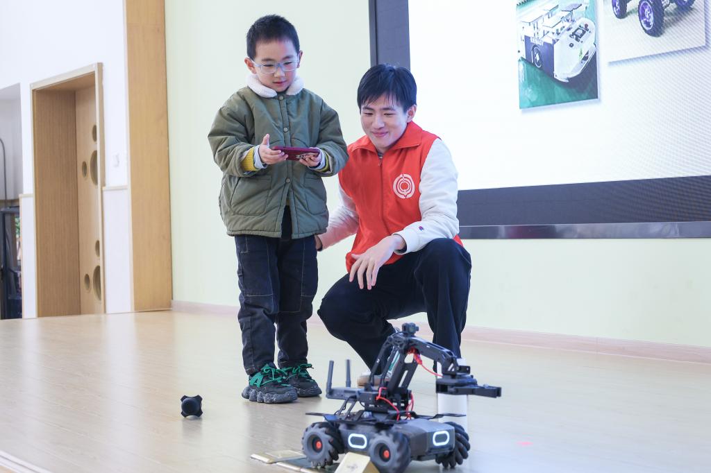 智能车俱乐部自主研发的作品——“无线智能机械臂小车”压轴登场,志愿者乐泽荣操控小车原地360度转弯、横向纵向平移、机械臂抓取矿泉水瓶,一套套“高阶”操作不断刷新小朋友们对芯片功能的认知。演示后,小朋友迫不及待亲身体验,在志愿者指导下动手操作智能车。 “哇!这个车太神奇了!”当水瓶被成功抓取时,小朋友们的惊叹声和掌声顿时充斥着整个教室。