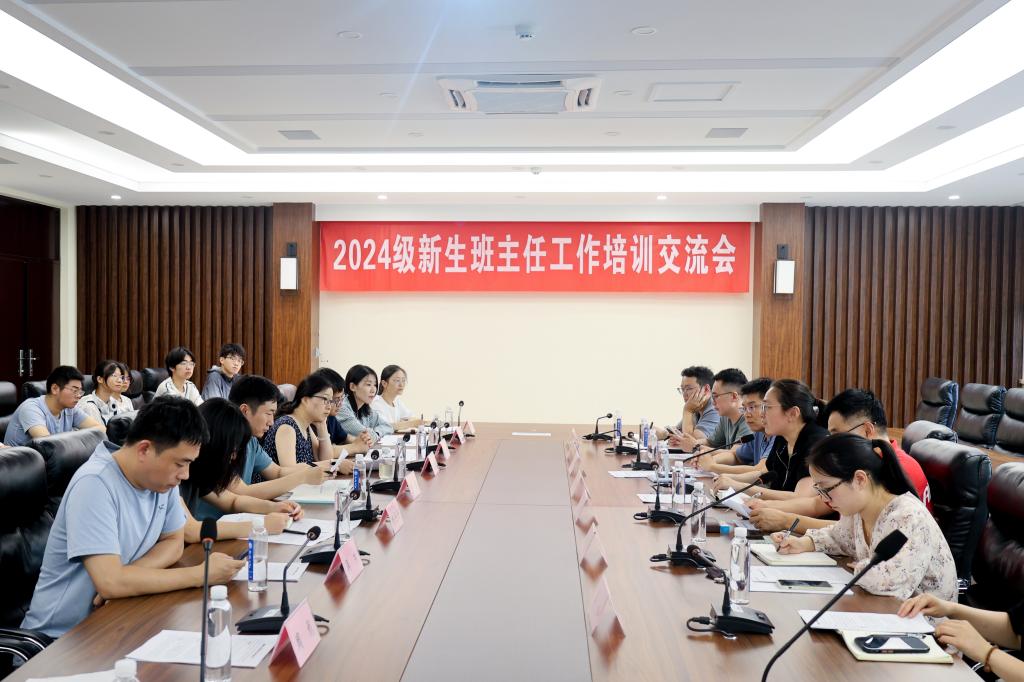 在学院B222会议室举办2024级新生班主任、班助见面会暨新生班主任工作培训交流会。学院党委副书记、副院长孔丽丹,信息技术系副主任顾斌杰,体育部教师宋校能,2024级新生班主任、辅导员以及班主任助理参加了此次会议。会议由学院学工办副主任李诗炜主持。
