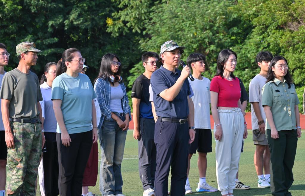 俞立峰代表学校对物联学子表示慰问与肯定,鼓励全体参训人员继续保持良好的训练状态,坚持高标准、严要求,积极投入军事训练,磨炼意志品质和身体素质,期待大家在不久后的全校军训成果汇报中展示丰硕成果。