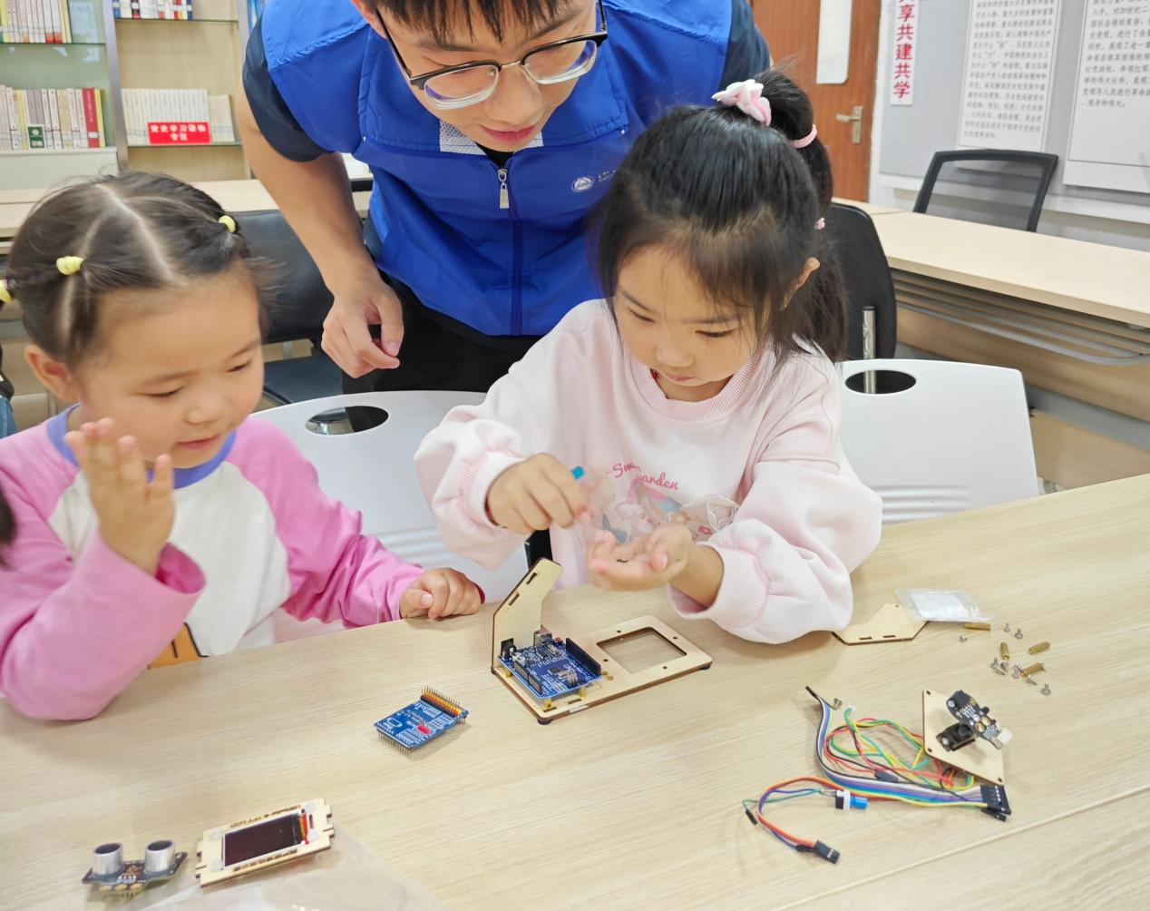 在党员的悉心指导下,孩子们分组合作,亲手组装起了雷达模型。当看到自己团队共同努力的成果——雷达模型成功运转,并实现了物体探测、距离显示等功能时,他们的脸上绽放出了灿烂的笑容,眼中闪烁着自豪与喜悦的光芒。这一刻,孩子们不仅收获了宝贵的知识,更在心中种下了对科学无尽的热爱与向往。