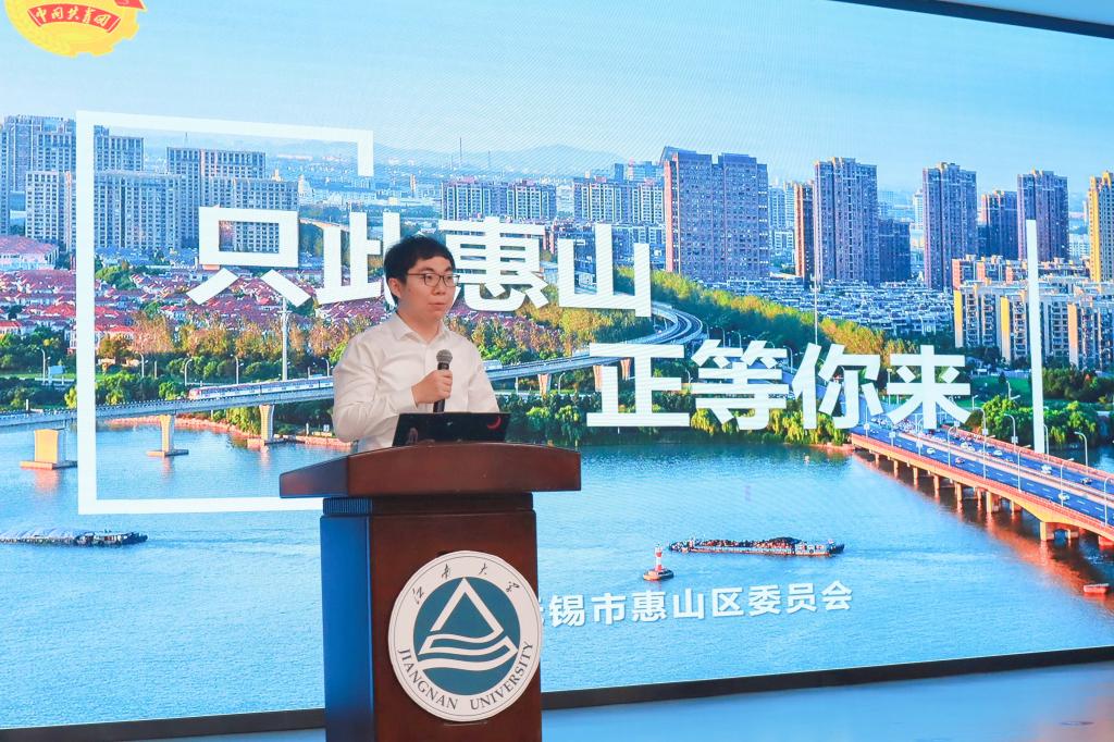 政策宣讲环节,校西部计划宣讲团成员张旭航以清晰的逻辑和详实的数据,围绕项目背景、运行机制、招募标准、服务领域等核心内容,对2025年度西部计划政策要点进行了系统而深入的解读。共青团惠山区委书记宋睿鑫以“一只桃子”的甜蜜产业、“一包三改”的革新精神、“天上村前”的百年文脉为引,将政策宣讲转化为充满江南韵味的生动叙事。他从岗位设置、服务流程到保障机制,再到职业发展通道,层层递进地介绍乡村振兴专项计划,热情邀请青年学子加入乡村振兴赛道,在大运河畔的惠山区,共同描绘千年江南文化底蕴与未来城市发展交融的壮美画卷。