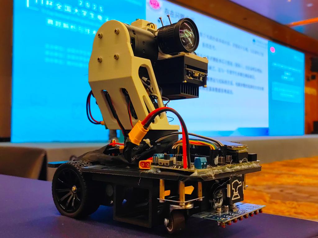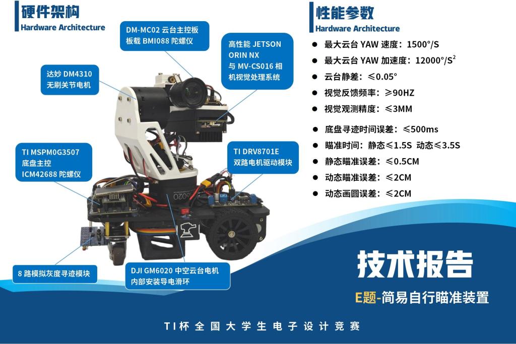 参赛队选择的E题要求设计制作一个简易自行瞄准装置,包含自动寻迹小车与瞄准模块两大核心部分。团队以MSPM0G3507为主控芯片,结合八路灰度传感器与陀螺仪数据,借助DRV8701驱动实现精准循迹。视觉系统采用高分辨率相机与边缘AI模块,通过CUDA加速实现高帧率、高抗干扰的目标识别;瞄准云台创新融合陀螺仪与双无刷电机,确保操控过程的稳定性。该系统性能表现卓越,静态瞄准时间小于1.5秒,动态瞄准时间小于3.5秒,误差分别控制在0.5厘米与2厘米以内,动态追踪性能尤为出色。作品凭借优异的指标与流畅的演示,赢得了评审专家的一致认可,最终摘得本科组“TI杯”。