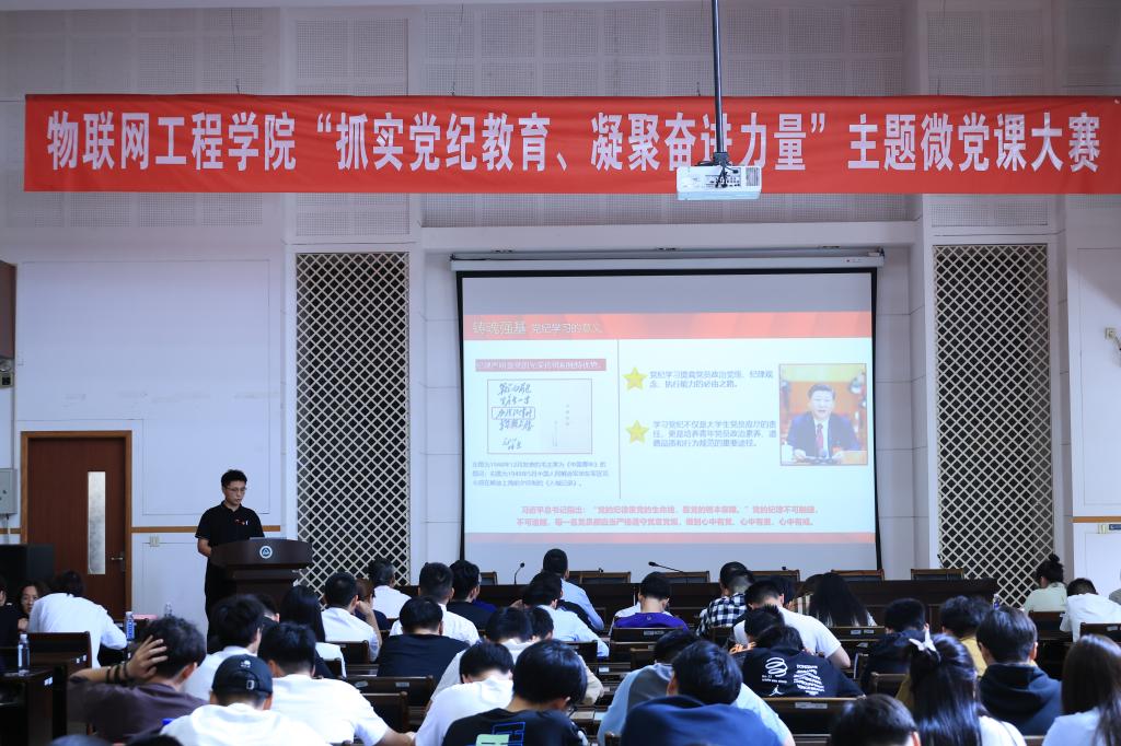 比赛现场,入围决赛的13名选手围绕严明党纪共筑青春防线、以党纪党规引领新质生产力、以科研铸盾护航国家安全、发扬大国工匠精神等鲜明主题,立足专业、结合实际、创新形式,从身边人、身边事出发,以具有亲和力、引领力的方式讲理论、论观点,具有较强的感染力、号召力和传播力,为师生们献上一场竞赛纷呈的党课,充分展现了新时代物联青年意气风发的精神面貌和强国有我的责任担当。